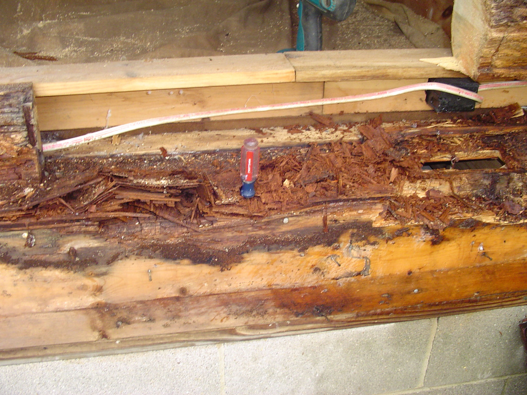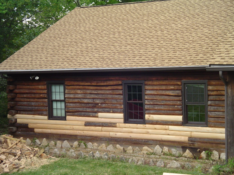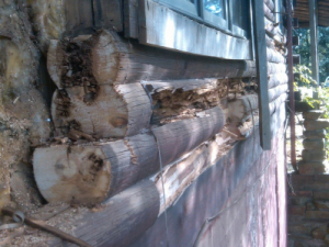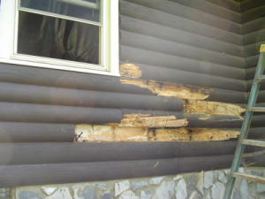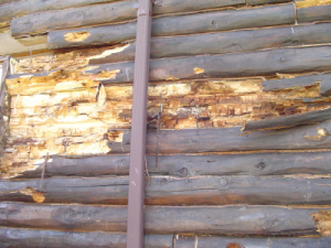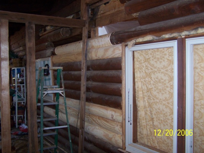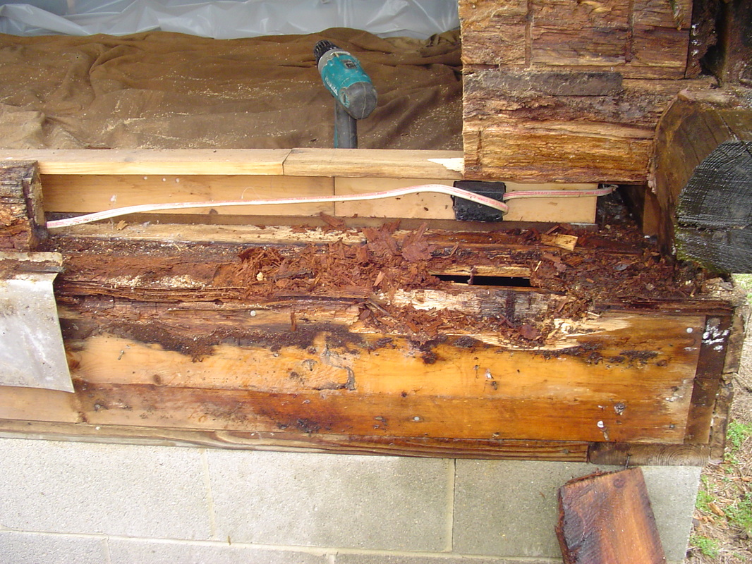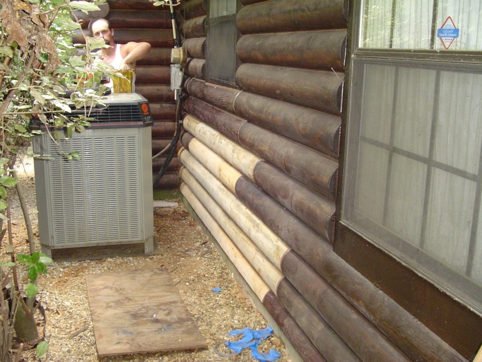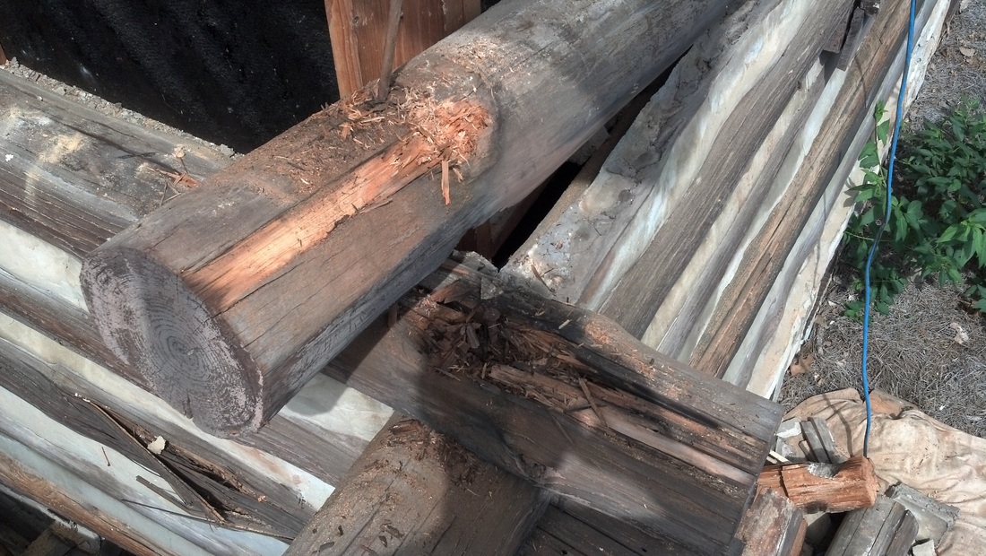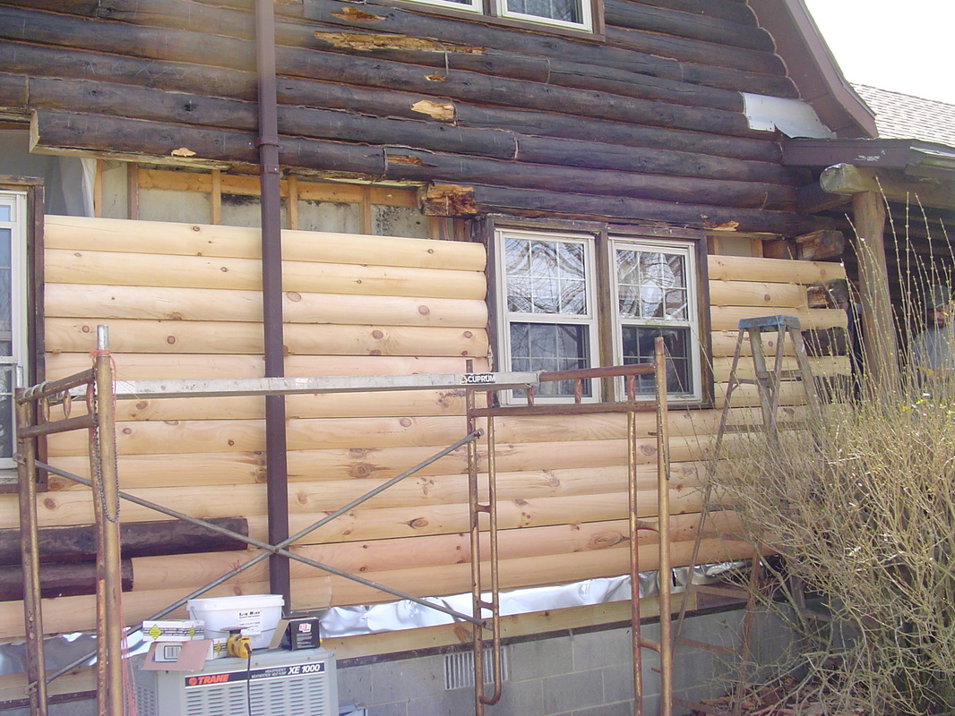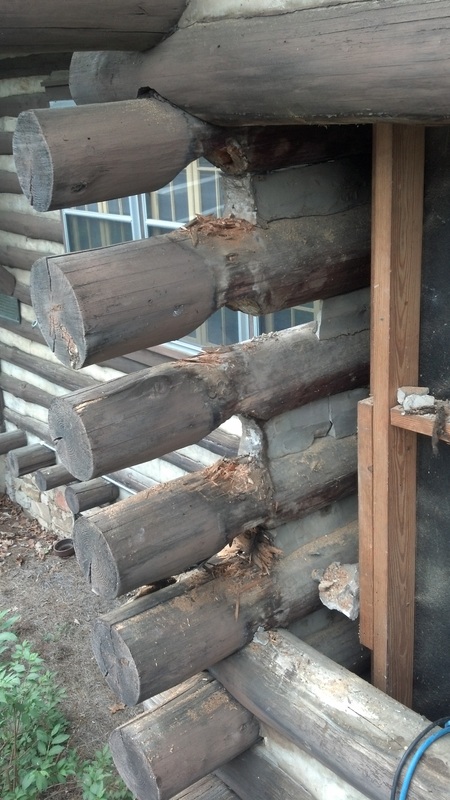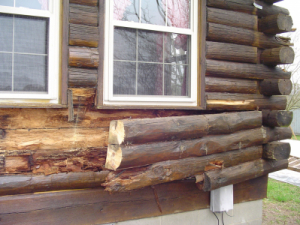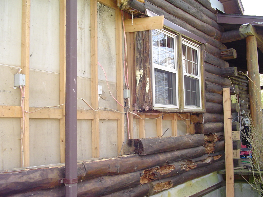 Here is a classic example of a home that someone "repaired" with a half log. Everything behind it is thoroughly rotted.